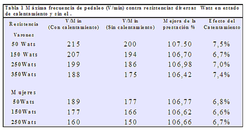 Los incrementos de prestación en la frecuencia de pedaleo fueron relativamente constantes, aumentando, concordemente cerca del 7% y fueron estadísticamente muy significativos.