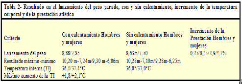 Por tanto, la influencia del calentamiento sobre la prestación en el lanzamiento del peso es escasa: