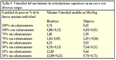 Por lo general, en el estado de calentamiento los valores de la aceleración contra determinadas resistencias submáximas y máximos fueron mejores que en el estado sin calentamiento, pero en ningún caso fueron estadísticamente significativos. Es evidente , que la mayor mejoría (+ 0,21 y + 0,31 m/s) se obtuvo cuando se utilizaron cargas rápidas (10% de la fuerza máxima). Probablemente, eso representa una prueba de que las prestaciones de velocidad estan particularmente ligadas a la regulación de la temperatura y dependen de ella (tabla 3). El experimento permite de concluir que una calentamiento de 20 min, ejecutado sin cargas de intensidad adecuada, sólo produce un aumento mínimo de la temperatura interior del cuerpo, no determina la posibilidad de incrementar de modo importante (es decir estadísticamente significativo) las prestaciones de velocidad, aunque en escasa medida, se pueda notar una tendencia a la mejoría de las prestaciones, que concierne, en particular, el componente de rapidez.